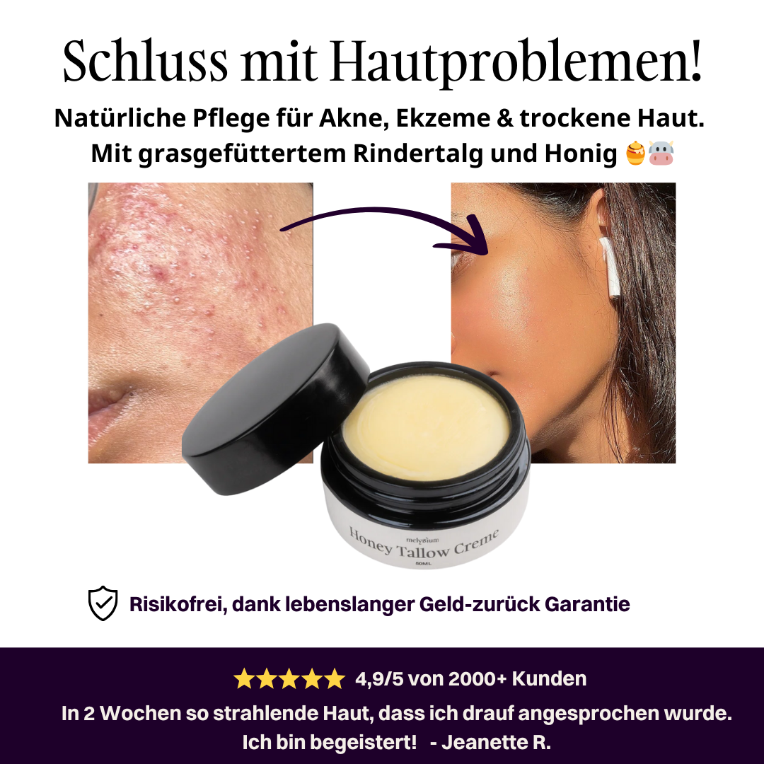 Our Honey Tallow Cream is the perfect solution for anyone who wants to care for their skin with natural and highly effective ingredients. Developed for people who want to avoid chemical additives, our cream provides intensive moisture and nutrients for all skin types. Especially suitable for dry, irritated and sensitive skin, Honey Tallow Cream ensures healthy and radiant skin. The key to its effectiveness lies in grass-fed beef tallow, which is bioidentical to human skin and has been used in skin care for thousands of years.